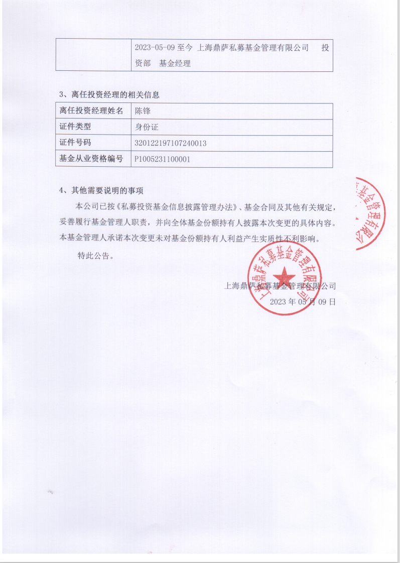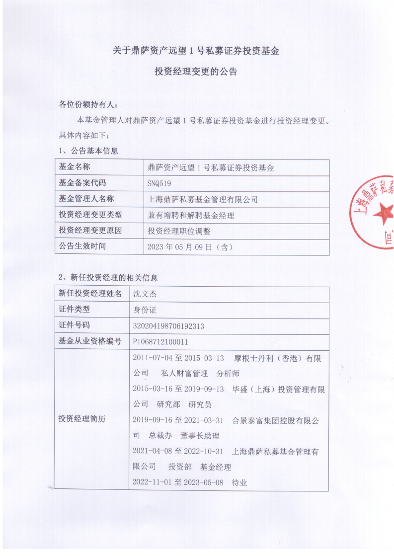 关于鼎萨资产远望1号私募证券投资基金基金投资经理变更的公告